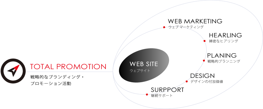 そして、WEBをプロモーション活動の中心に考えながら、同時に広告手段の1つと考え、あらゆる側面からみてビジネスの成功へ導くためのご提案を致します。